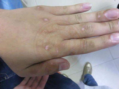 ▲病 史:患者家长主诉,孩子学习压力大,饮食、作息都很不规律,于两年前发现手部出现白斑,治疗效果不佳,今来我院治疗。