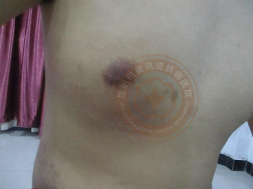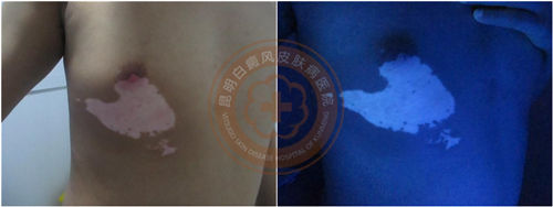 ▲病 史:患者自述,自己作息时间不规律,沉迷网游,平时经常夜网吧包夜,3年前发现胸部出现白斑,曾去过多家医院治疗,效果均为不佳,通过亲戚推荐,今日来我院就诊。