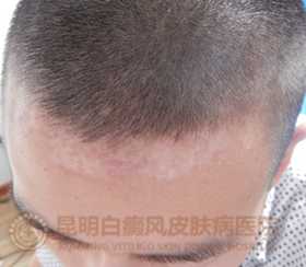 ▲病 史:患者于3年前发现头皮至额头部出现白斑,过去曾在当地用外用药治疗