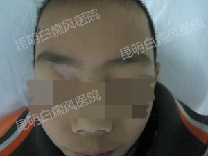 (2013年5月6日,初诊时,眼周白斑明显,色素脱失严重,边缘模糊,白斑处于进展期)