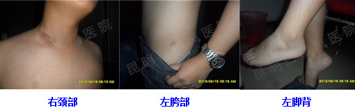 ▲病 史:患者于2年前前发现颈部出现白斑,由烫伤导致一直治疗未停,效果不明显,病情加重扩散至胯部、脚背,今来我院治疗