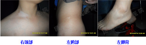 一段时间后,隐形白斑消失,颈部白斑缩小,左胯部及左脚背白斑基本色素加深,疗效显著)