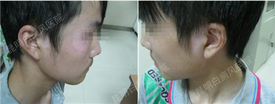 (针对患者病情,医生采用我院特色中西医结合治疗进行治疗,一个疗程时间后,白斑处大量产生黑色素,基底颜色加深,疗效显著)