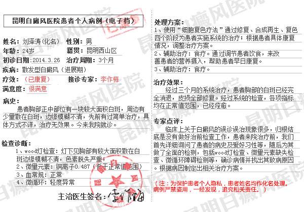 我胸部的白斑已经有一段时间了,先前也没有治好。今年3月底来到昆明进行治疗,三个月不到就治好了。刚开始我还在郁闷,一块小小的白斑竟然治了两个多月才治好,但是我在网上贴吧上看到很多白癜风患者治疗了多少年都没有康复。才知道原来白癜风是这么难治的病,而我这三个月不到就治好了,也算是很快的了。感谢李作梅医生!